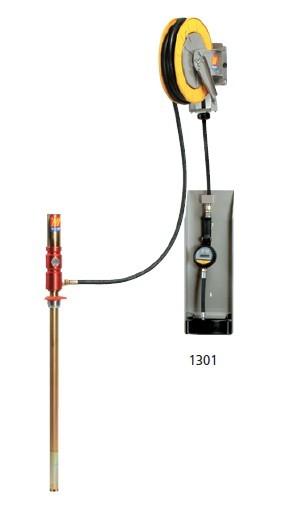 ME1302用于750-1500L油桶,配有: R=5:1bar气动提油泵 10m,R1 1/2” 提油软管卷盘 0.6m R1 1/2”外螺纹--内螺纹油管 数显流量计数提油喷嘴 接油盘