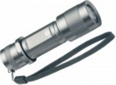 With high-performance 3 Watt power LED. High range. 2 different settings and flashing function. Elegant, robust aluminium housing with wrist strap. ON/OFF switch with soft-touch-function in "American Style" at the end. 3 standard batteries AAA type includ